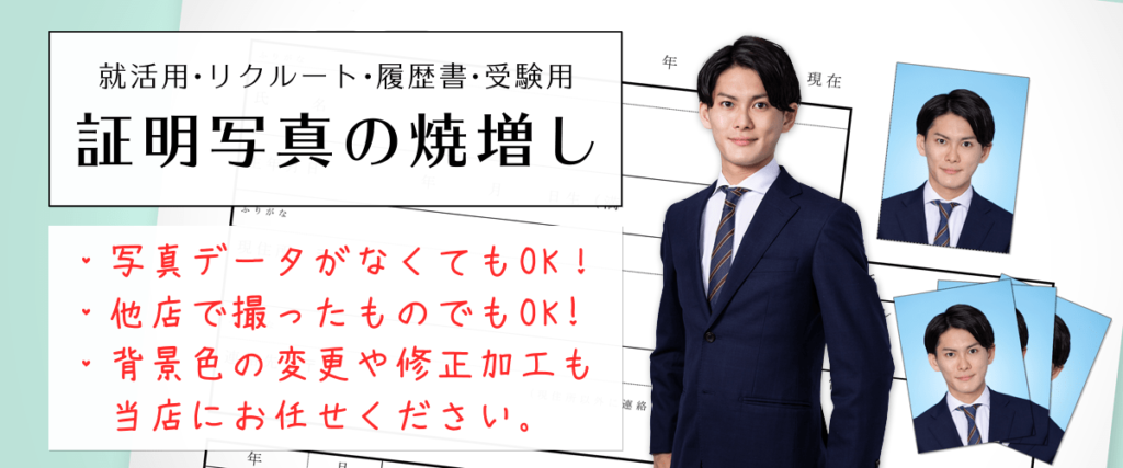 当店で撮影したデータまたは他店の手持ちの証明写真から焼増しします!
